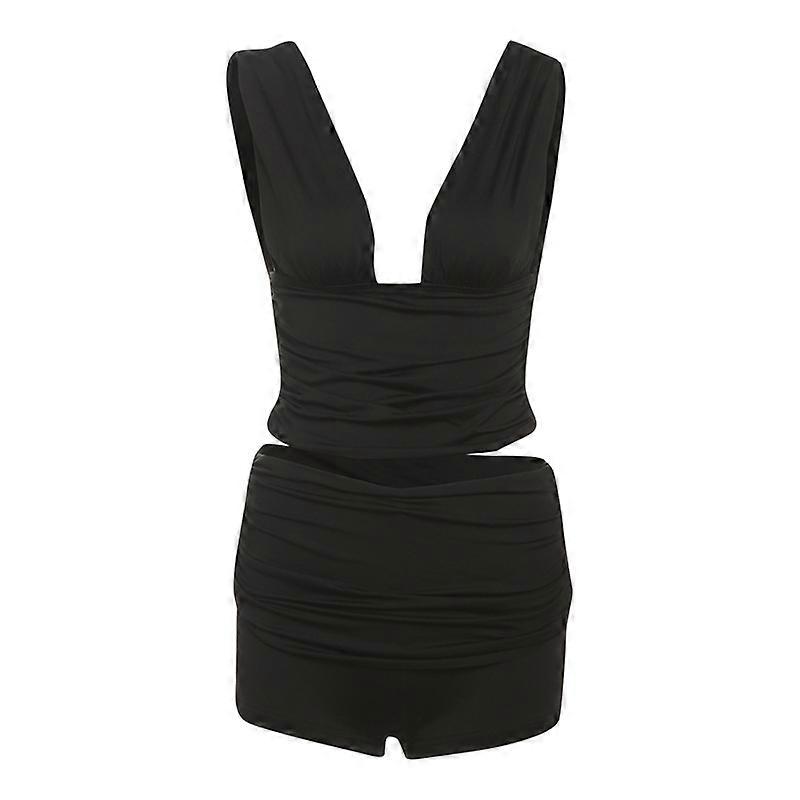 Women's Summer Sexy Deep V-neck Solid Color Tank Top High Waist Slim Fit Pleated Shorts Two-Piece Set