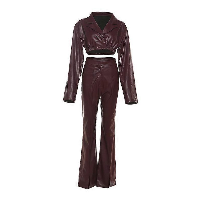Autumn/Winter Women's Sexy Collared Cropped Top and High-Waisted PU Leather Pants Two-Piece Set