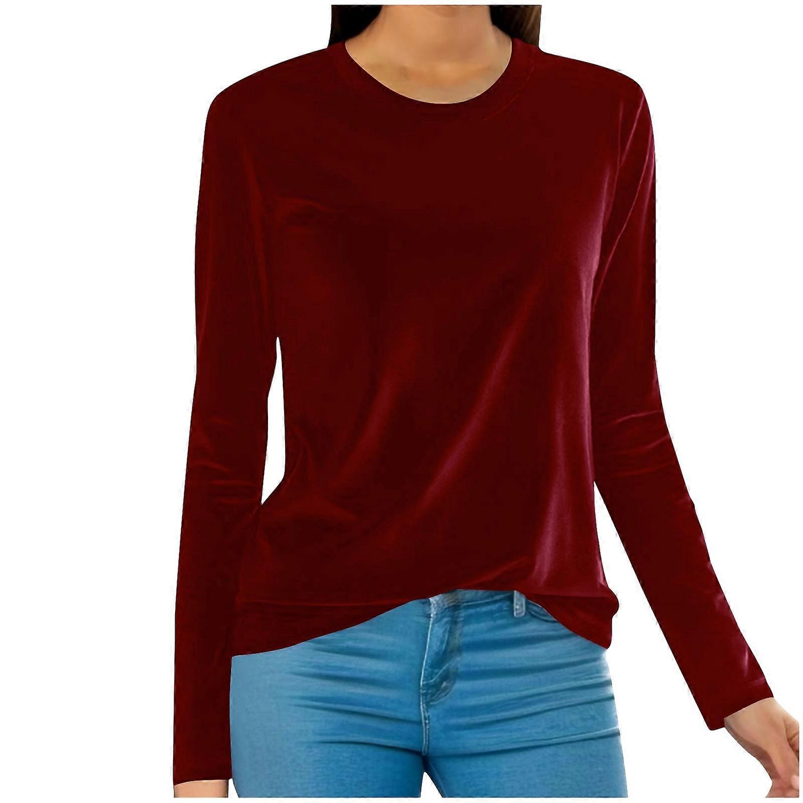 Women's Long Sleeve Crew Neck Shirt Cover Up Pullover Solid Color Casual T-Shirt Velvet Top Burgundy 4XL