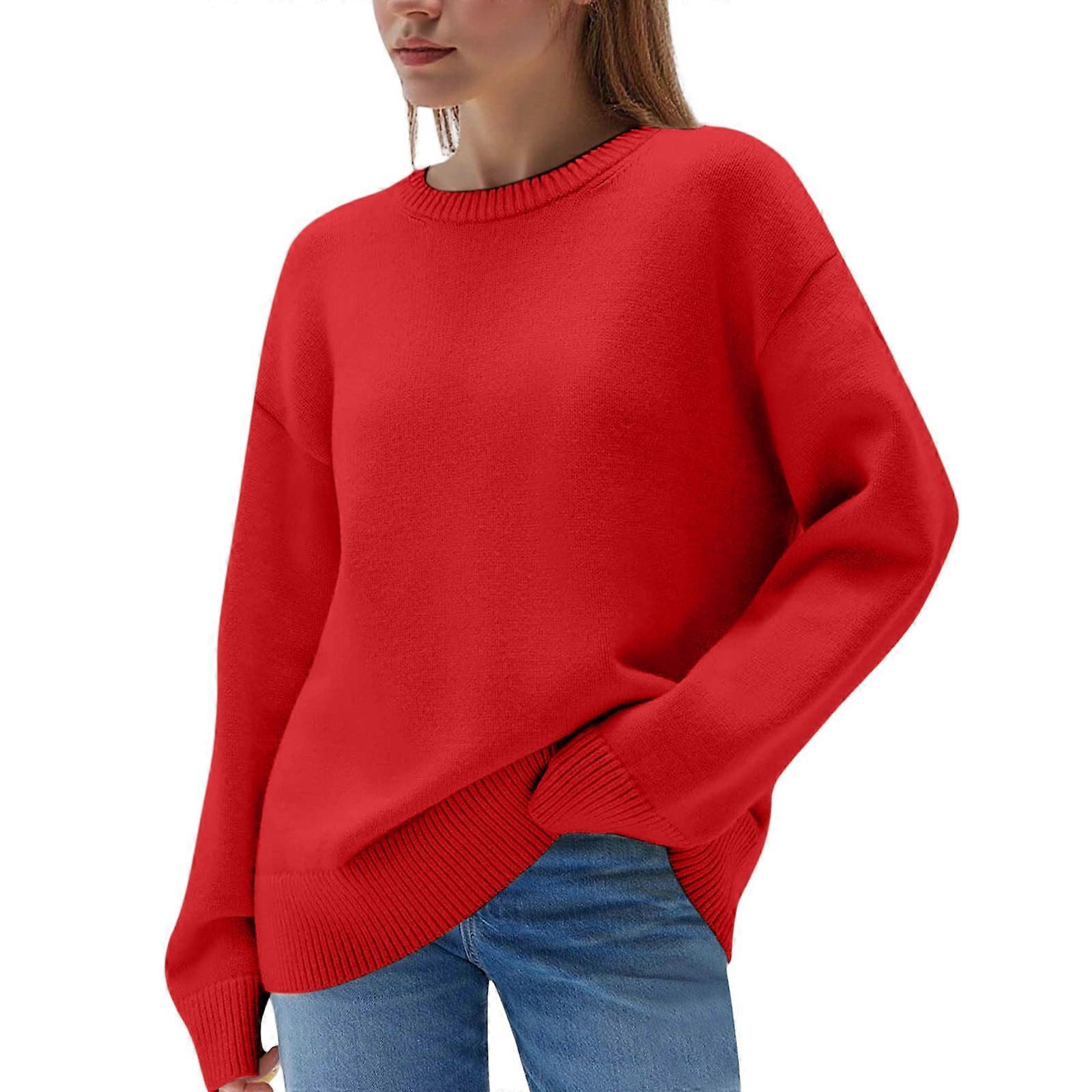 Women's Loose-fitting Long-sleeved Solid Color Crew Neck Chunky Knit Pullover Sweater - Fashionable and Casual Autumn Burgundy XL