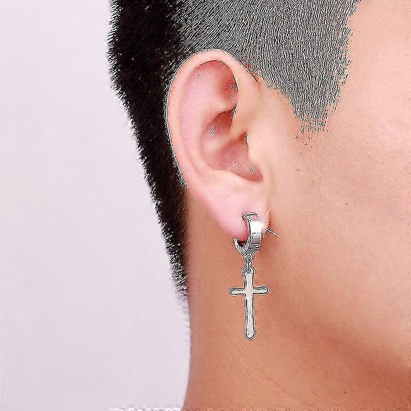 A Stainless Steel set of Non Drilled Clip On Cross Dangle Hoop Earrings, designed for a stylish look with No Drilling required.
