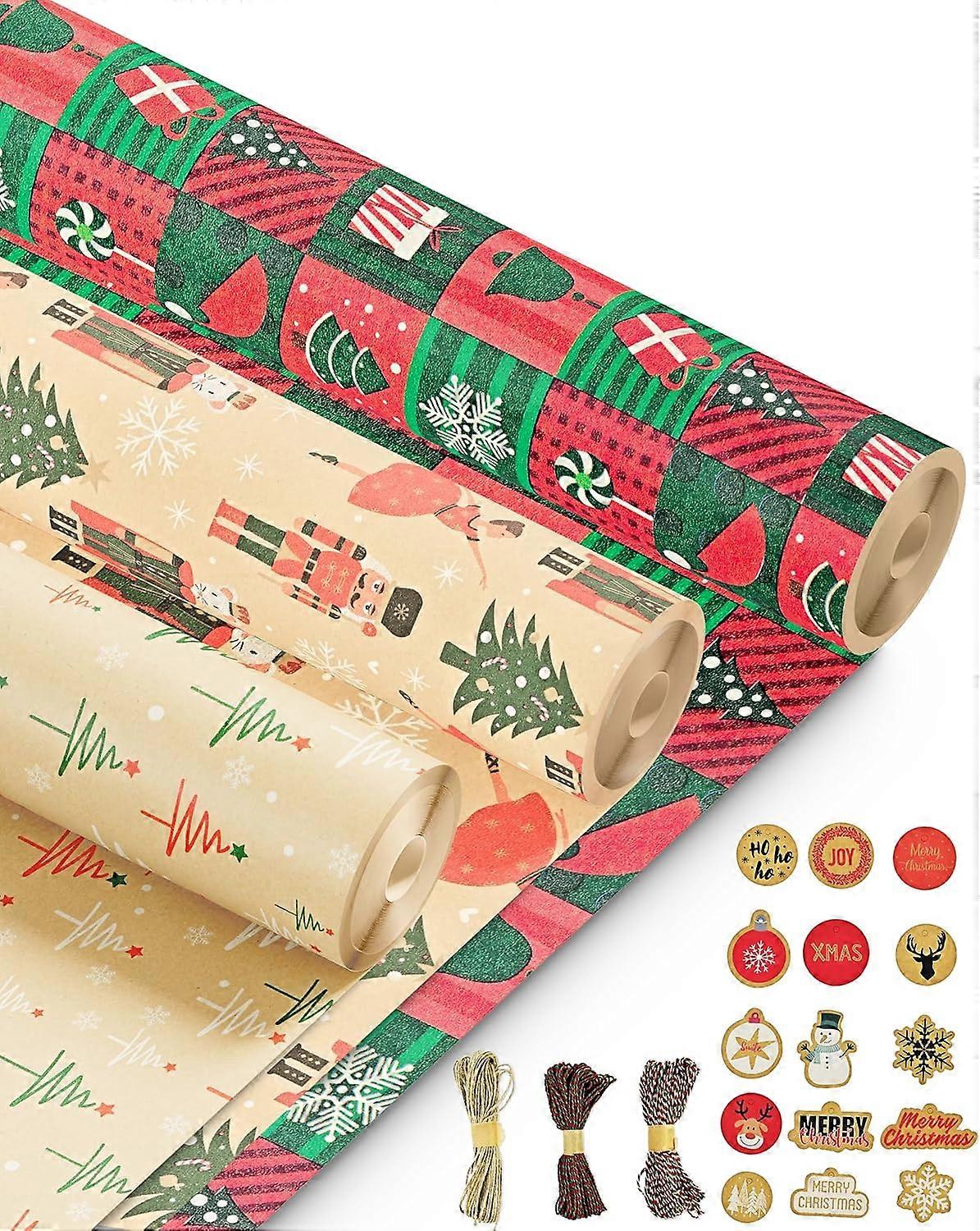 Kraft & Co – 3 Pack Kraft Xmas Wrapping Paper Rolls 69cm x 8m, Recycled & Eco-Friendly Gift Wrap with 15 Tags & 3-Color Twine, Xmas Wrap Tear-Resistan