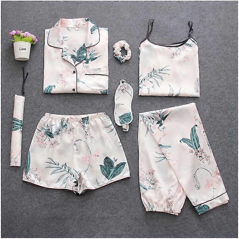 Women's 7 pieces Pajamas Sets Satin Silk Lingerie Homewear Sleepwear Autumn Gift
