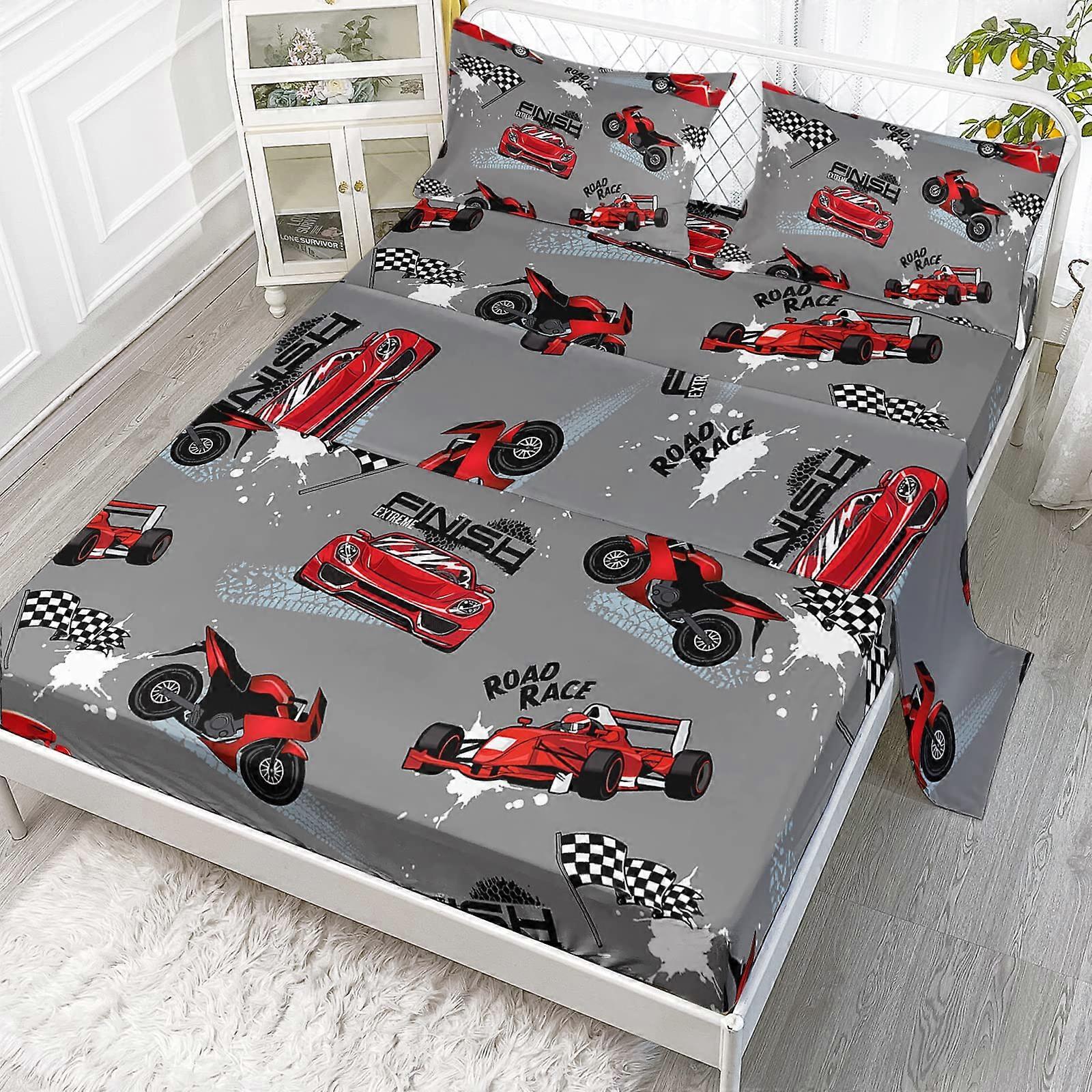 Racing Car Bedding Set Twin Size with Fitted Sheet Flat Sheet 2 Pillowcases for Kids Teens Boys Girls Red Grey