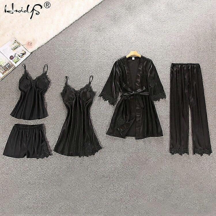 Women Pajamas Silk Satin Lace 5PCS Set Lingerie Sleepwear Babydoll Nightwear Pj