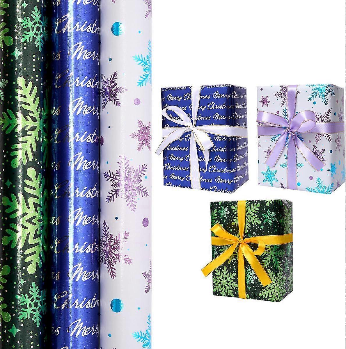 3 Rolls Gift Wrapping Paper for Xmas, 43cm*3M Shine Wrapping Paper Print with Snowflake and Merry Xmasfor Xmas, Birthday, Festival Party Gift Decor