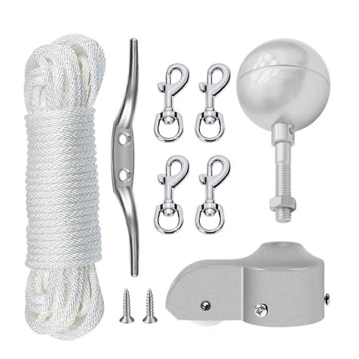 3inch Flagpole Ball Topper:Made of Metal with anodized finish decor,comes as a whole part with a diameter of 3inch.Long spindle shaft is perfectly fit through a solar flag light,jam nut can firmly locked the solar flag light. 2inch Flagpole Truck with Nylon Pulley:Made of Metal,fits flagpole with outside diameter from 1.6inch to 2inch .The nylon pulley keep the flag rope for pole sliding smoothly through, for flagpole halyard rope, you can easily raise and lower the flag.3pcs inset screws make the truck on flagpole top more stable. 50FT-1/4inch Flagpole Halyard Rope:Made of 12 strands of 100% Nylon,designed for all-weather use.1/4 inch diameter can easily pass through the pulley,50FT long compatible with flagpoles up to 25FT. Flag Pole Cleat with Mounting Screws:Made of Metal with finish decor, and long lasting use for fastening rope to flagpole.2pcs stainless steel mounting screws can fix the cheat on flagpole more easy.6inch length and distance between side is 0.7inch. Flag Swivel Hooks:Made of Metal with finish decor,.0.4inch opening size is suitable for most standard grommet flags Color: Silver Material: Metal Package Contents: 1 x Flagpole Hardware Repair Parts Kit Only the above package content, other products are not included. Note: Light reflection and different displays may cause the color of the item in the picture a little different from the real thing. The measurement allowed error is +/- 1-3cm.