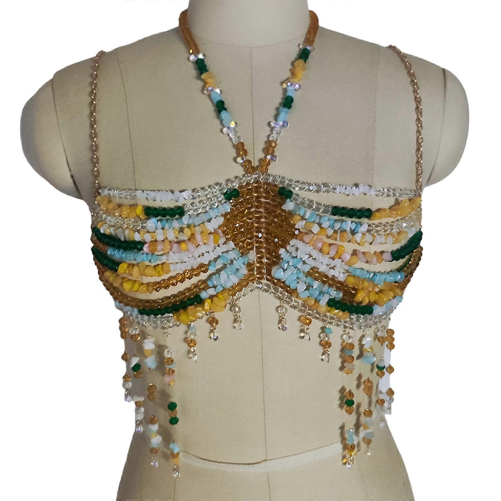 Women's Exotic Colorful Beads Tassels Halter Neck Bra Body Chain Jewelry Bustier Top for Beach and Festival Raves Outfit Yellow