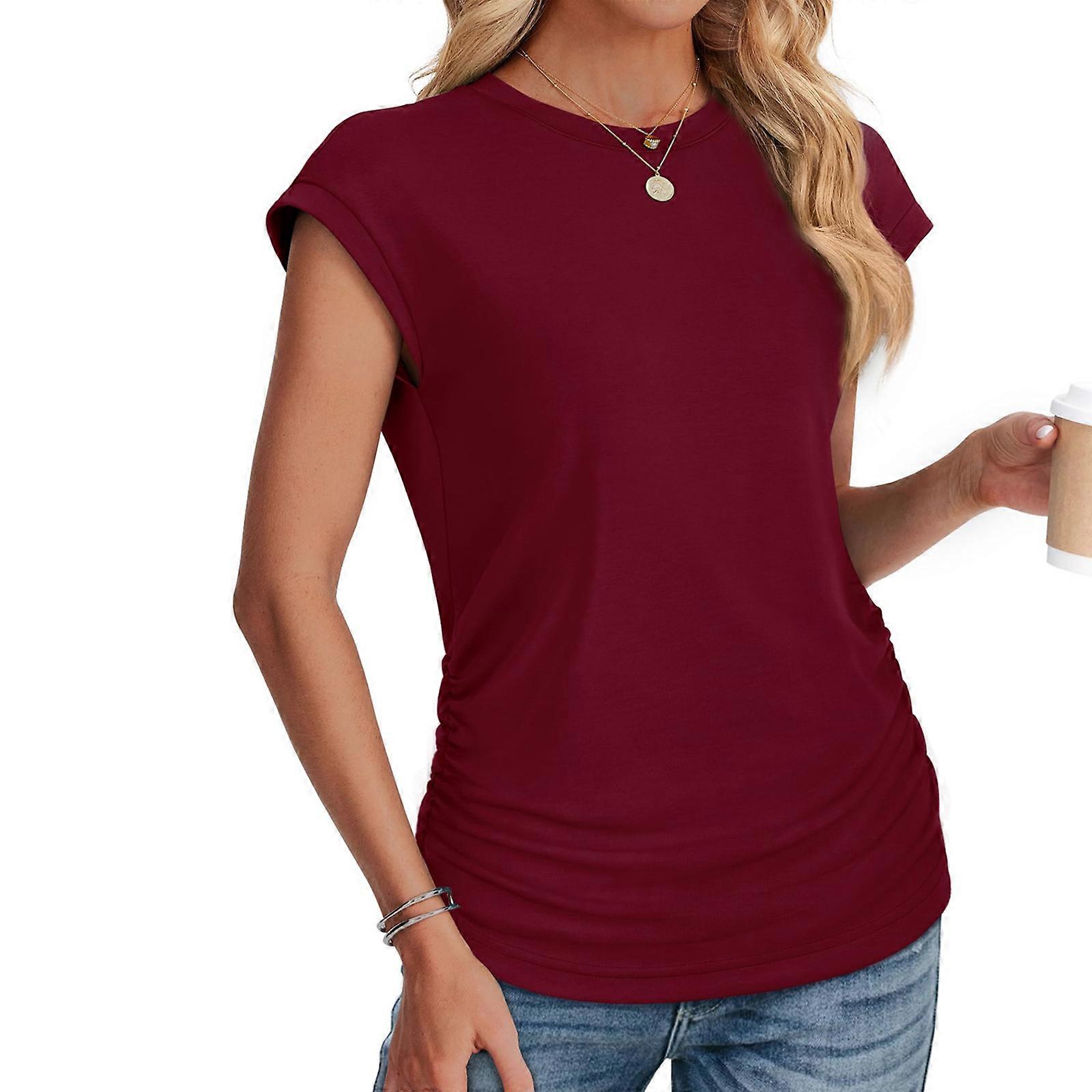 Summer Women's Crew Neck Caps Short Sleeve Regular Fit T-Shirt Fashion Basic Tops Side Shirring Ruched Solid Color Tee Burgundy XL