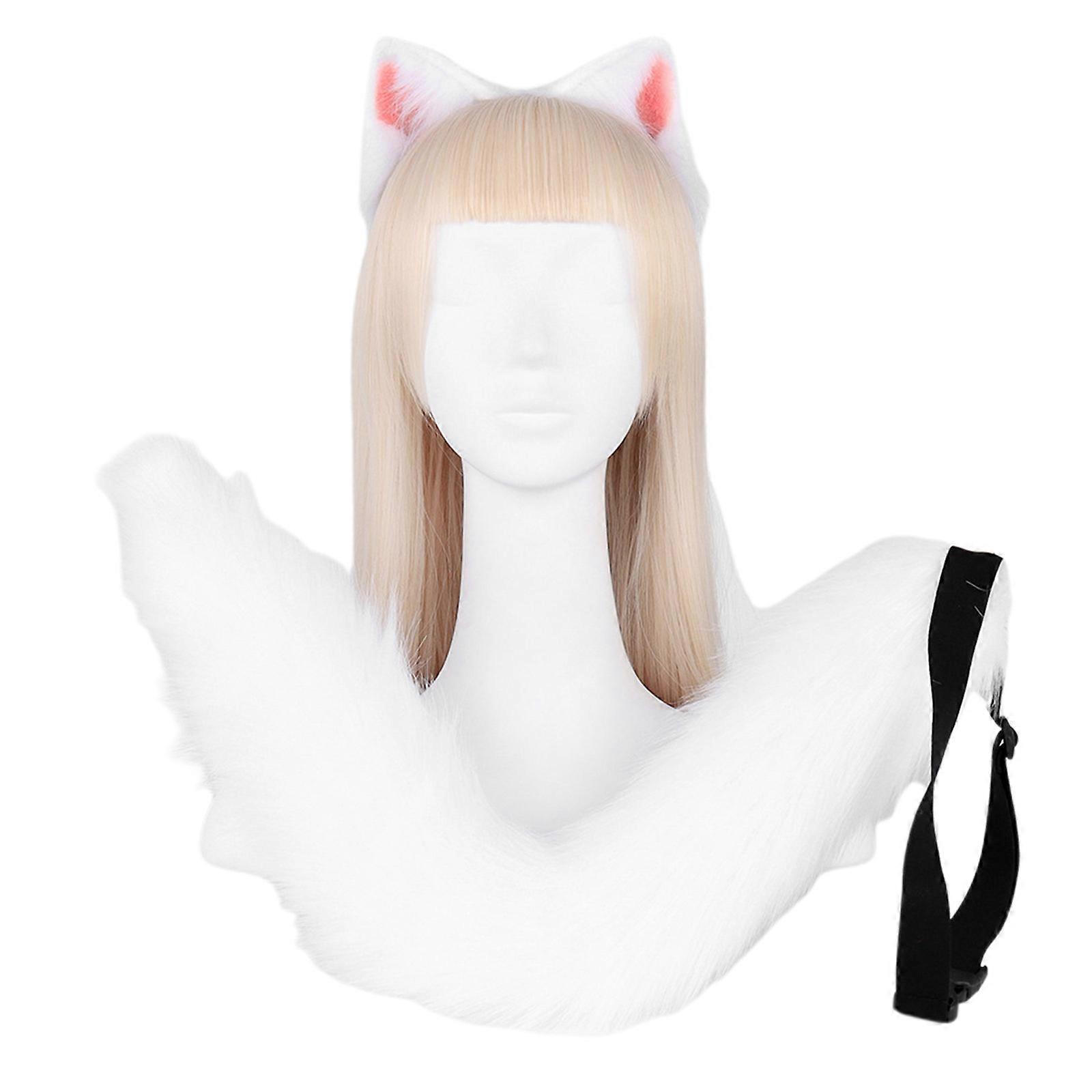 Foxes Cats Ears Headband and Faux Fur Tail for Halloween Cosplay Party Costume Accessories Cats Ears Tail Set for White powder