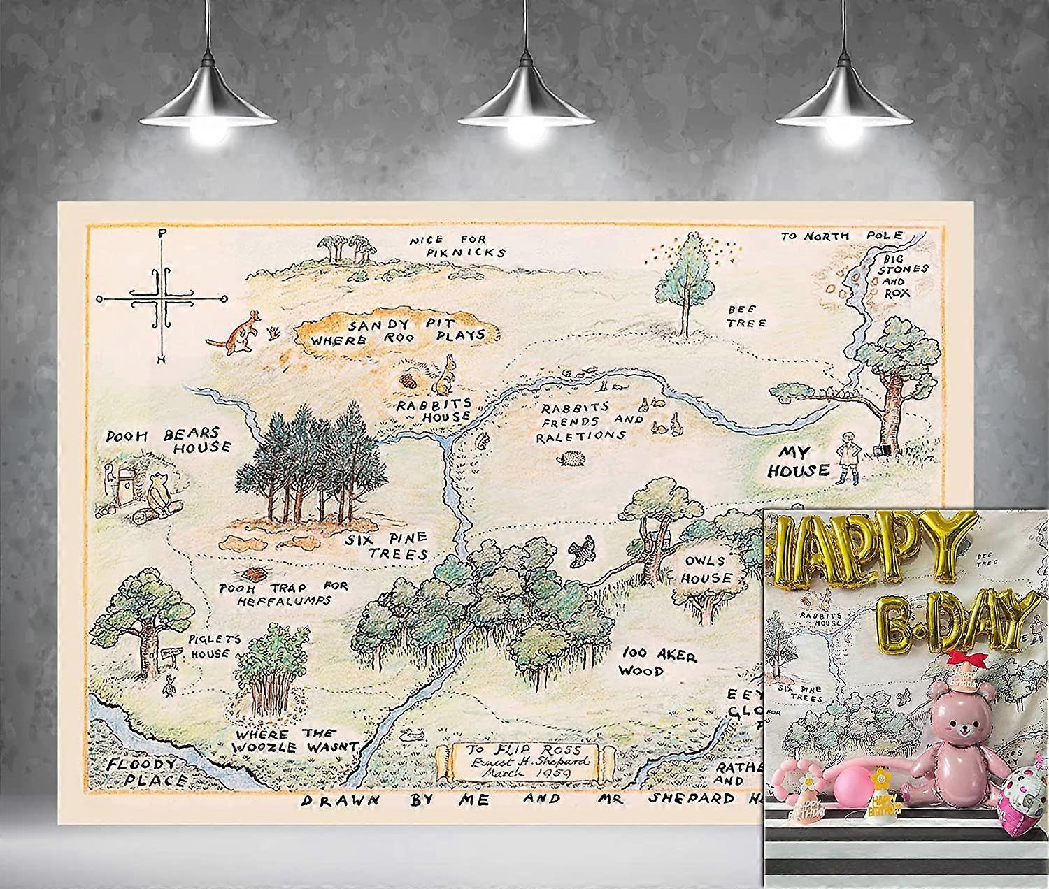 7x5ft Fabric Happy Birthday Bear Home Map Photography Backdrops for Kids 1st Birthday Background 100 Acre Woods Bear