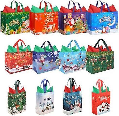 12 Pack Christmas Bags with Tissue Paper, Assorted Size Christmas Tote Bag for Gifts Present with Handle, includes 4 Extra Large, 4 Large, 4 Medium Xm
