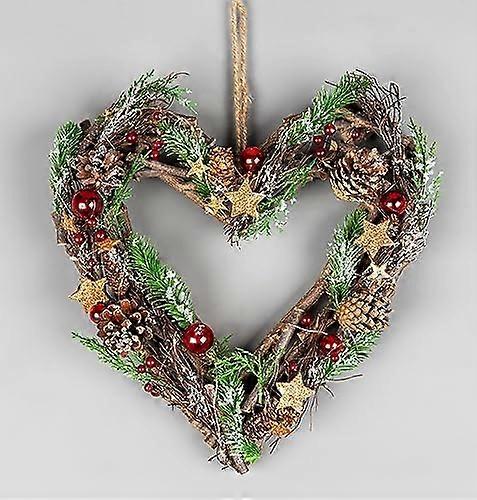 35cm Prelit Heart Wreath Battery Operated - Wooden Twigs Base Decorated with Red Baubles,Berries,Stars,Foliage,Pine Cones, Micro Rice LED Lights - Chr