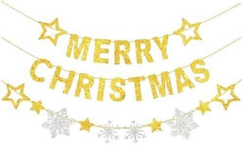 Merry Christmas Banner,Gold Star Hanging Garland Set with Silver Snowflake,Merry Christmas Banner Bunting Party Decorations Hanging Backdrop Banners O