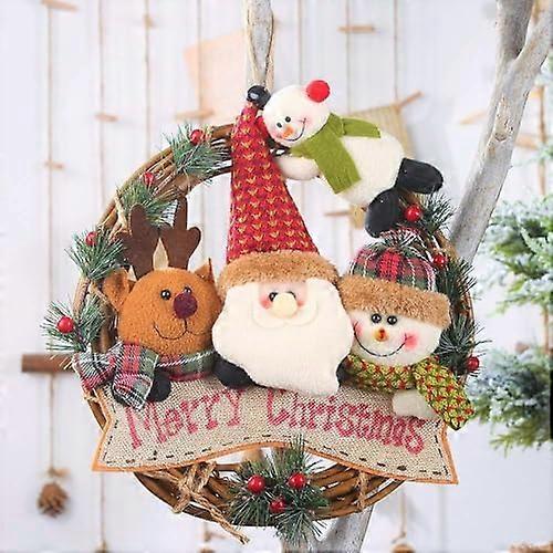 Christmas Doll Wreath, 30CM Christmas Doll Hanging Wreath Artificial Rattan Pine Leaves Red Berries Wreath with Elk Santa Snowman Plush Doll for Xmas