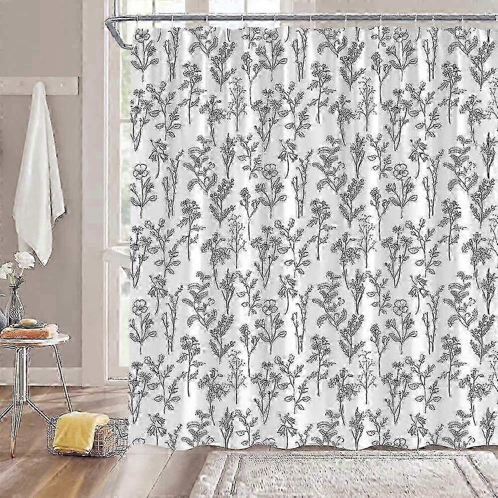 White Black Vintage Botanical Shower Curtain Boho Floral Herbs Retro Leaves and Flowers Rustic Farmhouse Cute Plant Modern Bathroom Decor Fabric