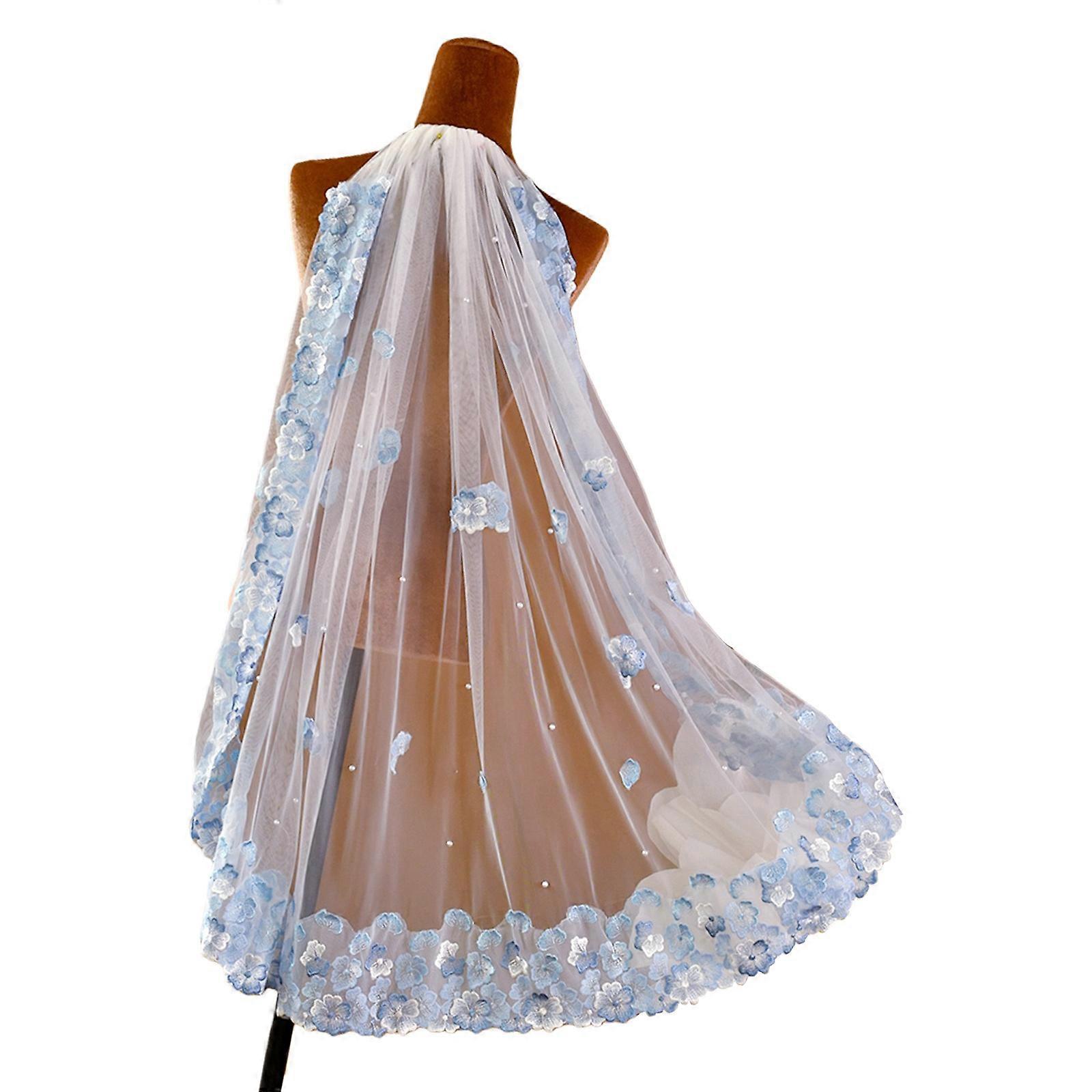 Lace Trimmed Veils with Embroidery Blue Flower Applique For Wedding Ceremony Photography Formal Event Dressingup Headveil White
