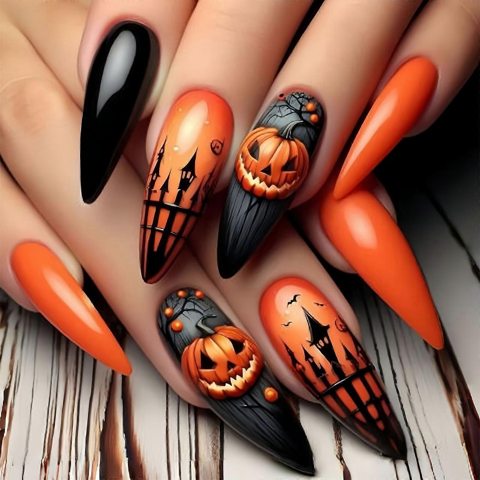 Elegant Almond Fake Nail Halloween Party Accessory Glossy Pumpkin Art Lightweight Long Wear Nail Enhancement 24pcs Multicolor