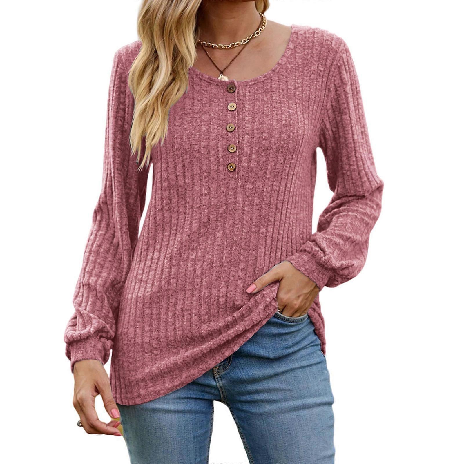 Women's Long Sleeve Round Neck Button Sweater Solid Color Cable Knit Casual Loose Pullover Red XL