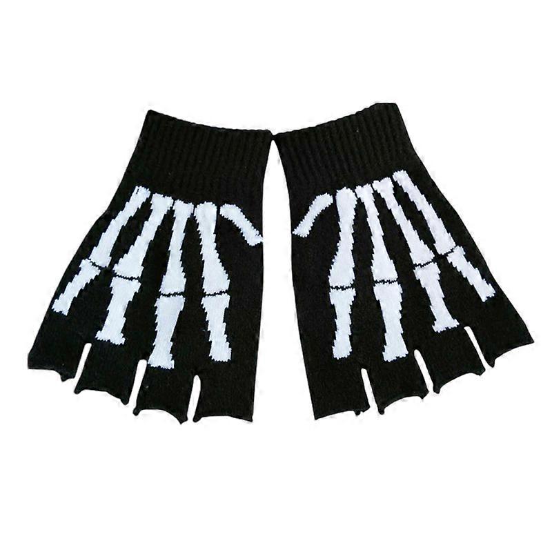 Halloween Knit Gloves With Skull Pattern Half Finger Design Lightweight Warmth For Adults Teens Costume Party And Daily Use Black