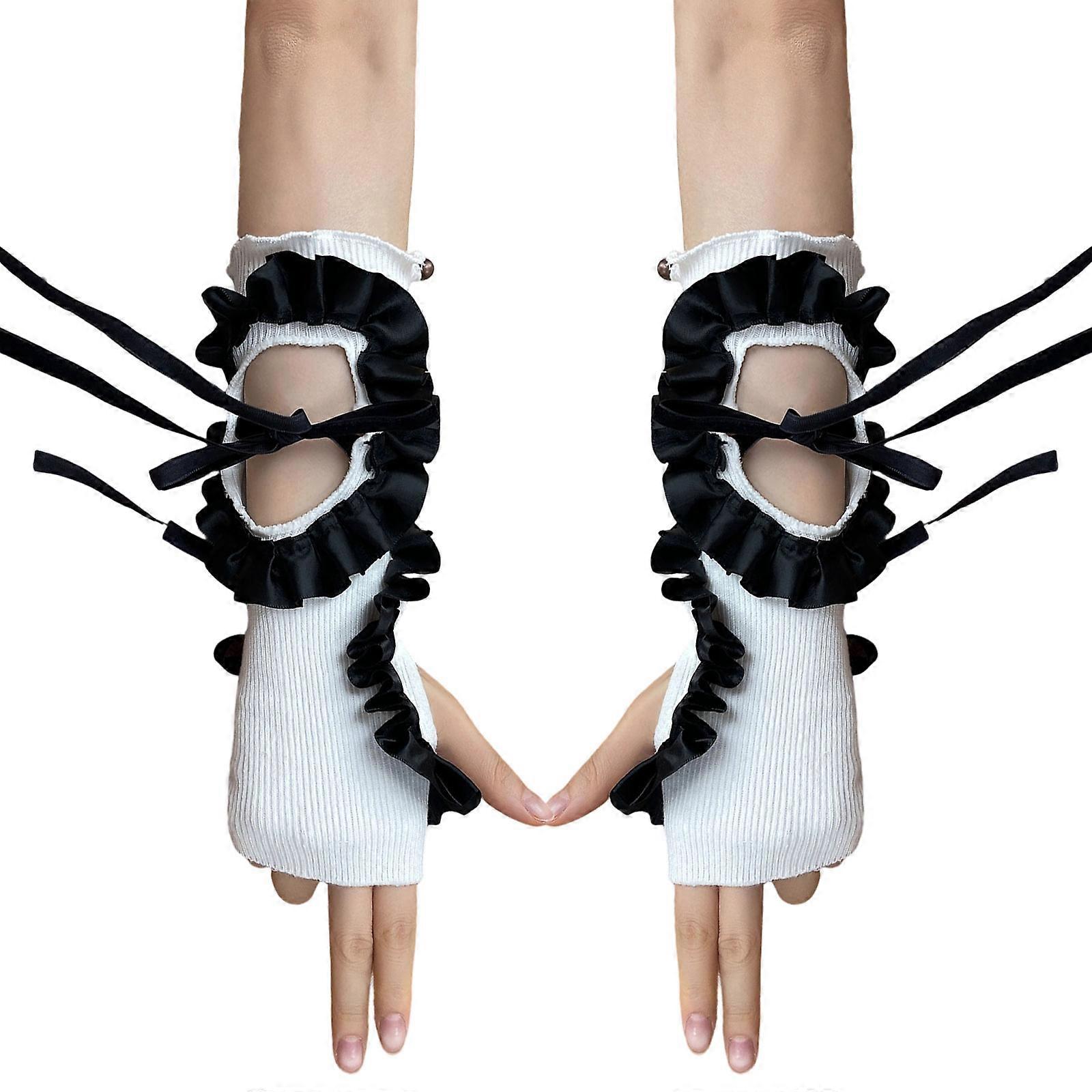 Lolitas Crinkled Hollow Out Gloves Satins Lace Ribbon Adjustable Wrist Sleeves For Women Party Fashion Accessories White