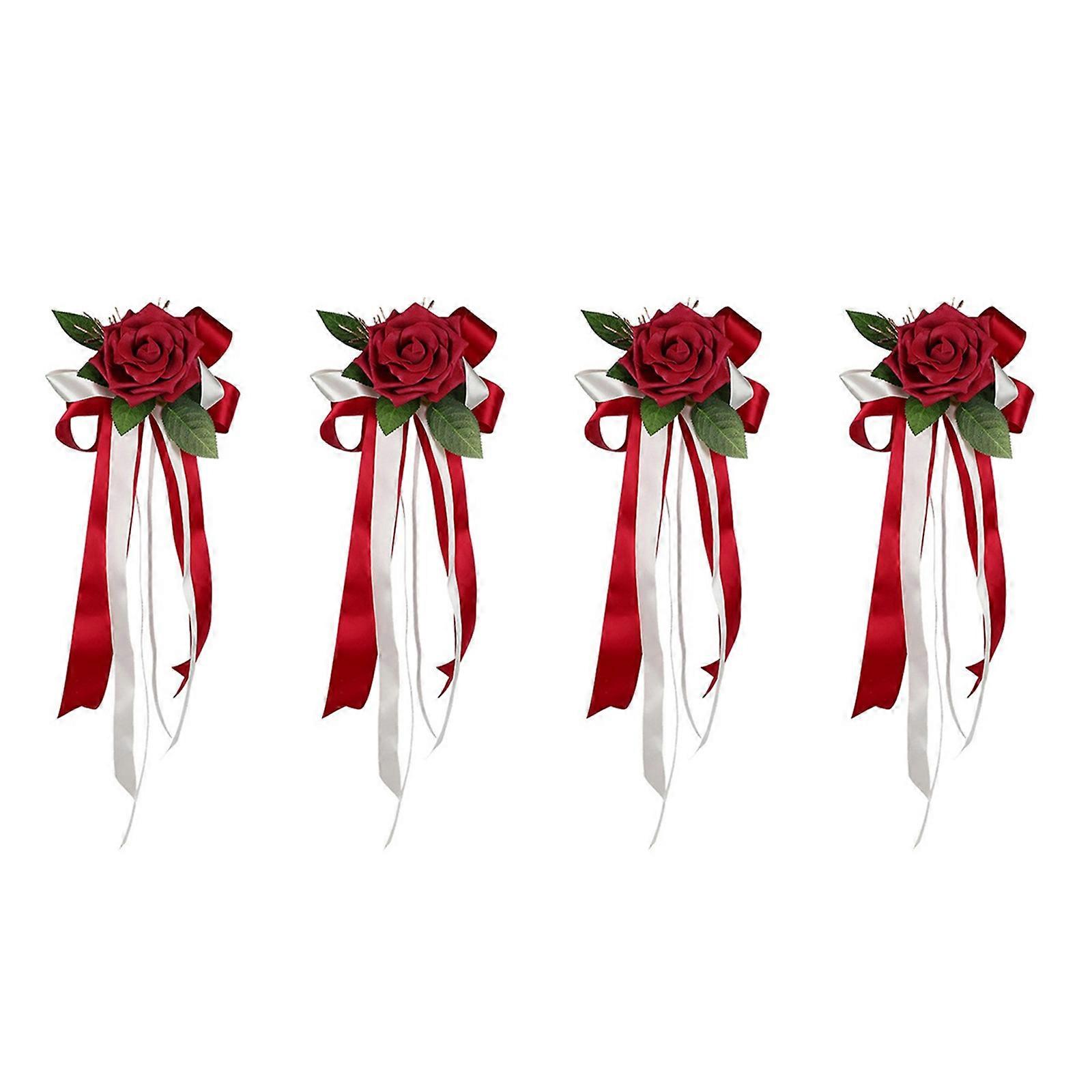 4Pcs Artificial Flower Ornament Rearview Mirror Flower Decorations With Ribbon For Wedding Car And Bridal Showers Burgundy
