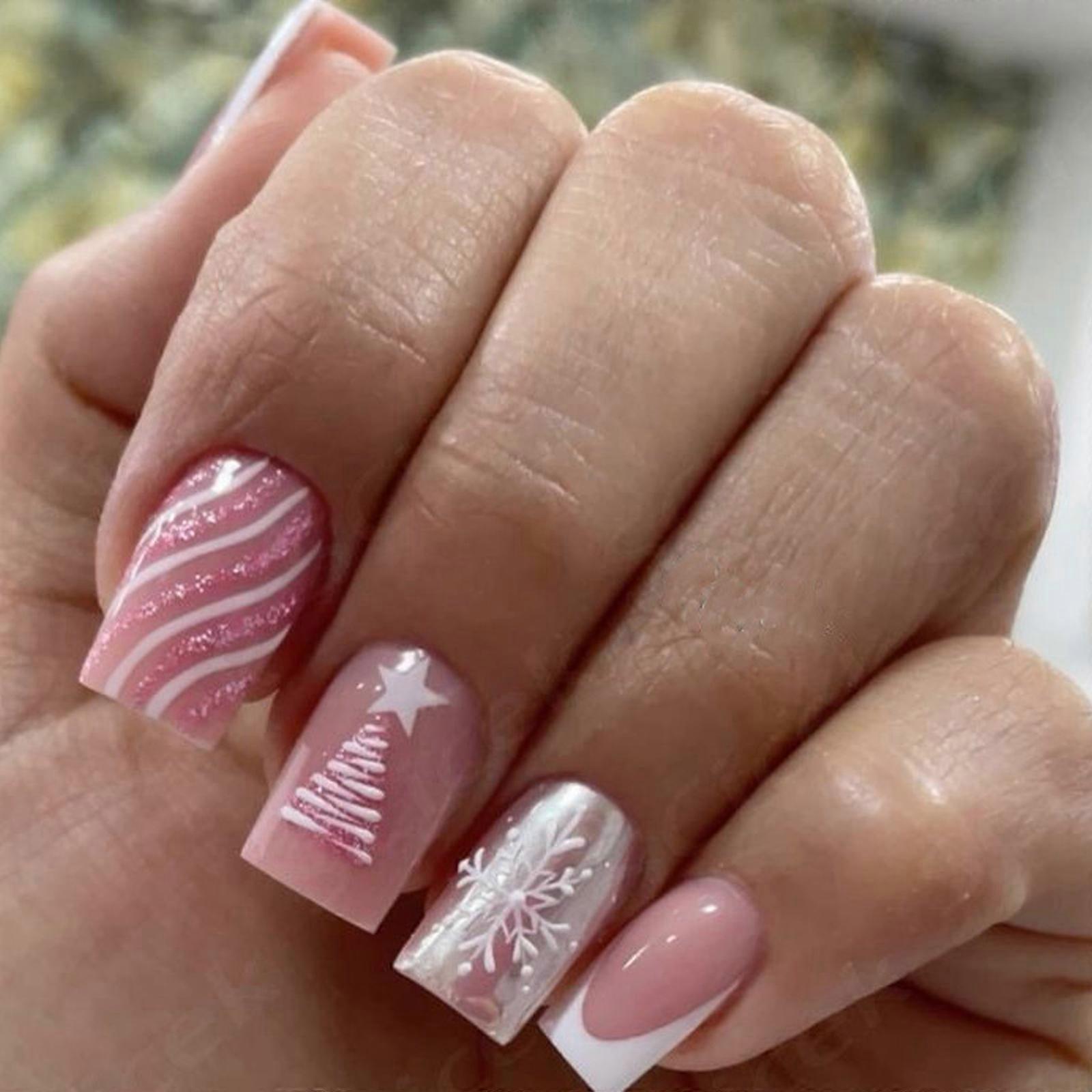 Christmas Party Fake Nail 24Pieces/Box Pink Snowflake Design Durability ABS Press On Nail for Special Event Gatherings Multicolor