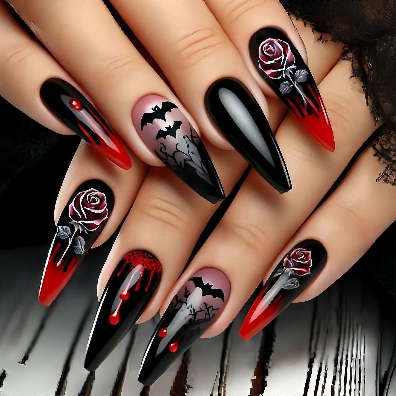 Bloody Rose Blood Drip Fake Nail ABS Build Halloween Fake Nail With Bat Wing Design For Horror Theme Parties 24pcs Multicolor