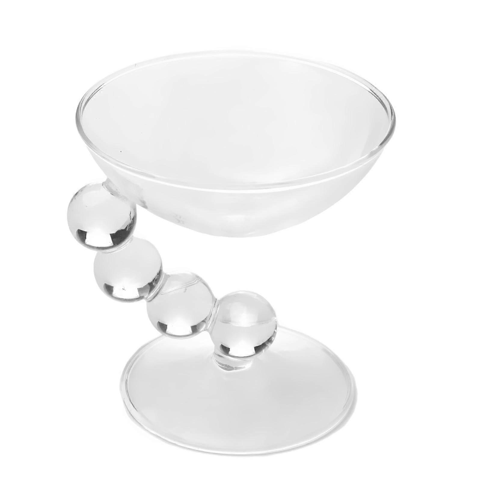 Elegant, timeless design: A footed glass dessert bowl with a beaded rim that elevates afterdinner treats and complements table settings without overpowering them. Clear presentation: Transparent glass shows off colors and textures of ice cream, pudding, parfaits or fruit, making desserts more appealing to guests. Practical beaded 'handles': The raised beaded detail acts as decorative accents and provides a natural grip for carrying or passing the bowl. Sturdy, smooth glass: Made from quality glass with smooth edges and surfaces for a comfortable feel; built to be used repeatedly while maintaining its appearance. Easy care: Smooth glass surface wipes clean quickly and is suitable for regular household use. Singleserving size and versatile function: Designed for individual portions, this bowl works equally well as a dessert cup, snack dish, or a small display tray for jewelry and trinkets. Typical uses Dinner parties and casual entertaining: Serve ice cream, puddings, mousse or layered desserts to present individual portions with style. Special events: Use as elegant serving pieces or table accents for weddings, showers, and celebratory gatherings. Home organization and display: Use on a dresser or vanity to hold rings, earrings, or other small accessories. What makes it useful Combines attractive presentation with everyday practicality. Decorative beaded design that also improves grip. Durable glass construction for repeated use and simple cleaning.