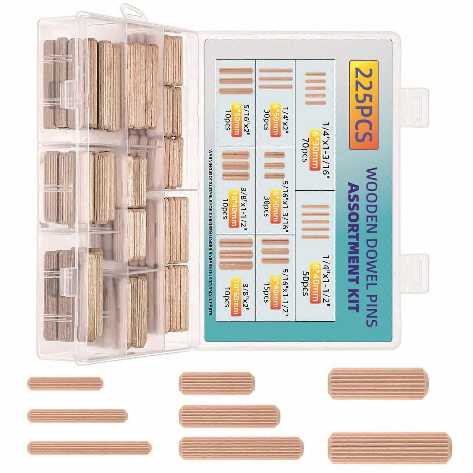 225Pcs Wooden Dowel Pin 1/4inch 5/16inch 3/8inch Fluted Rod Dried Beveled Hardwood Craft Woodworking Accessories Multicolor