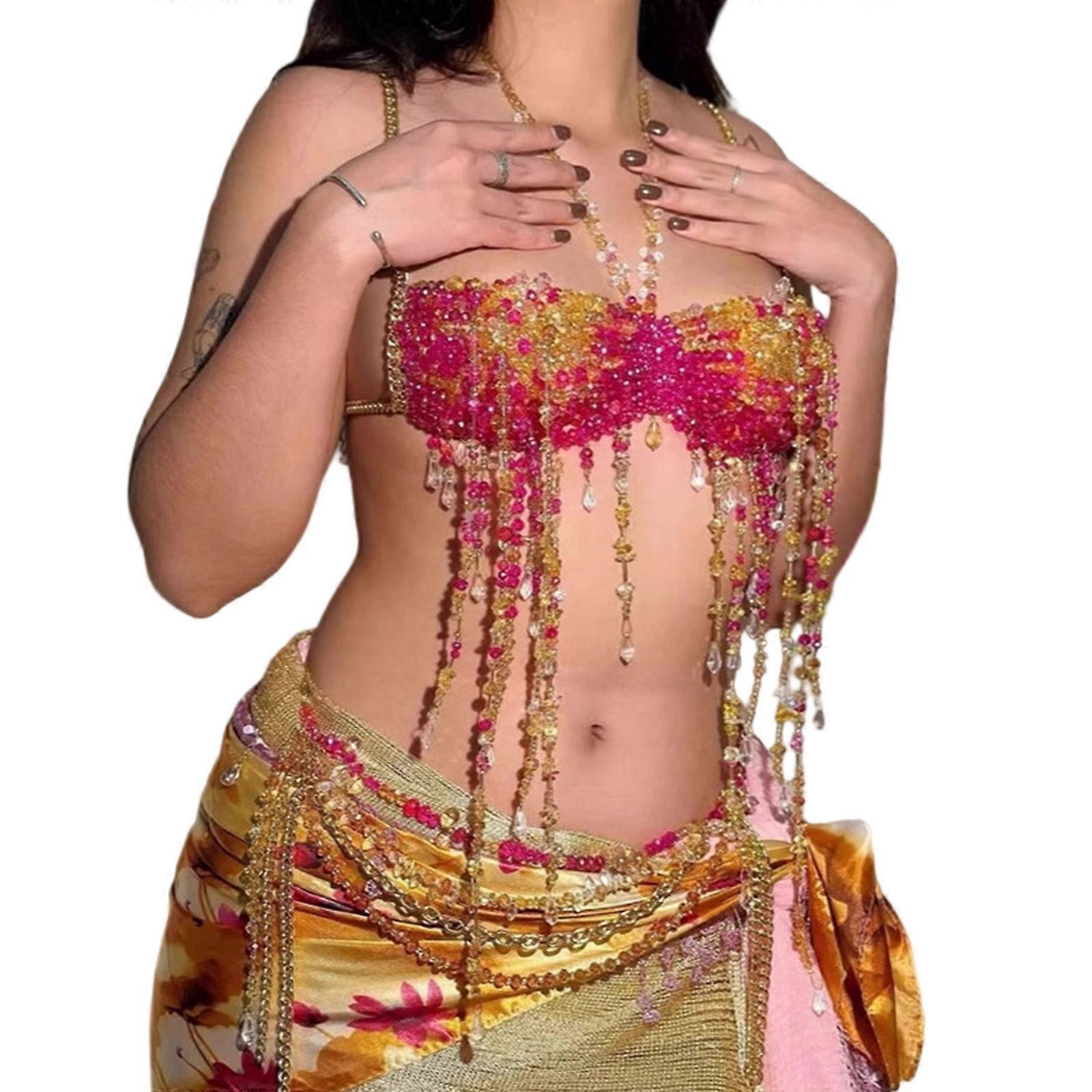 Beaded Fringe Body Chain Acrylic Layering Necklace Halter Neck Chest Chain Bralette For Women Fashionable Party Wear Multicolor