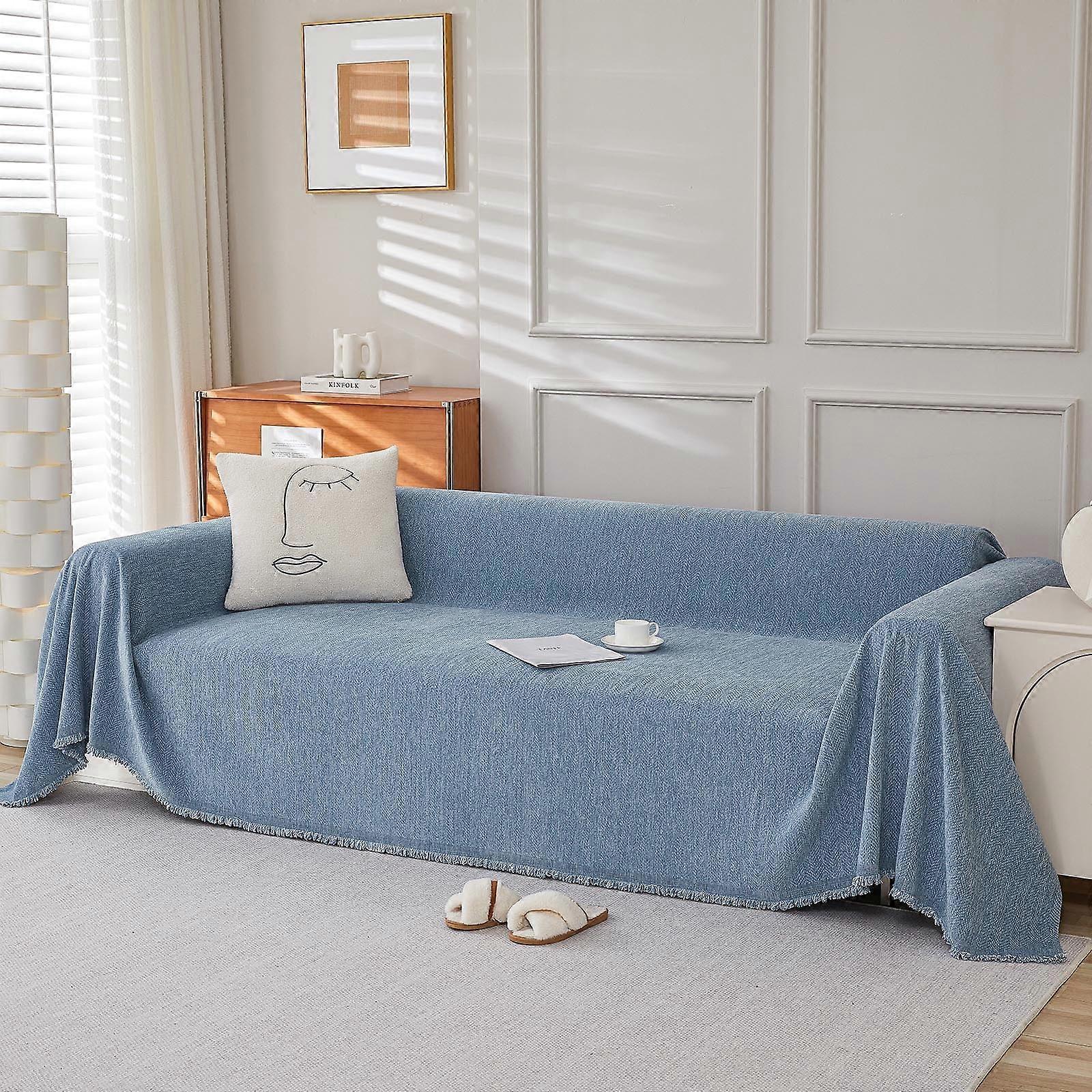 Luckky Blue Sofa Cover for Cats, Boho Washable Slipcover, Herringbone Chenille Pet-Friendly Couch Blanket 70.8" x 118"