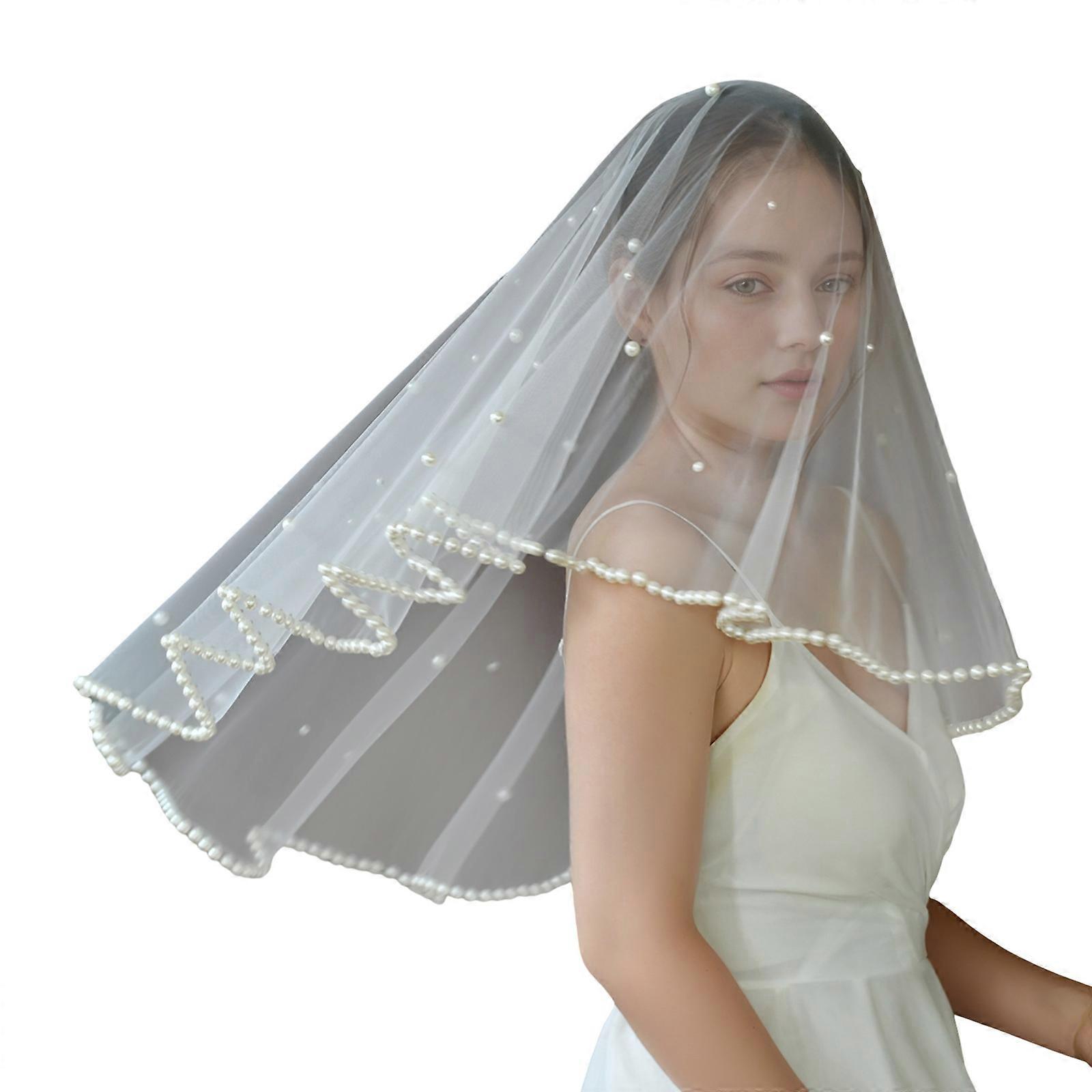 Arfiticial Pearls Decors Bridal Veils Elegant Tulle Head Covering Sheer Seethrough Veils For Wedding Formal Occasion White