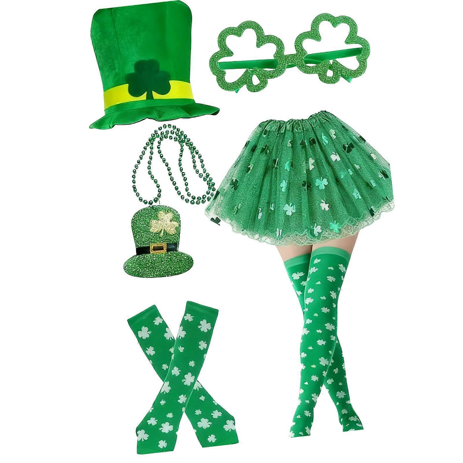 Complete Irish Holiday Outfit Shamrock Print Dress Matching Hat Necklace 7pcs Celebration Ensemble Costume Accessory Green