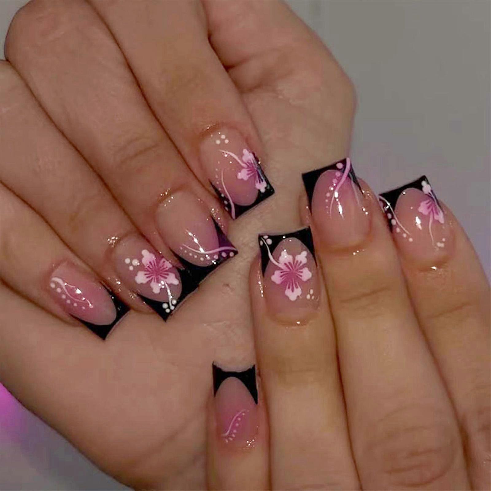 Black Red Flower Nail Stickers Plastic Press On Nails For Daily Use And Special Occasions Multicolor