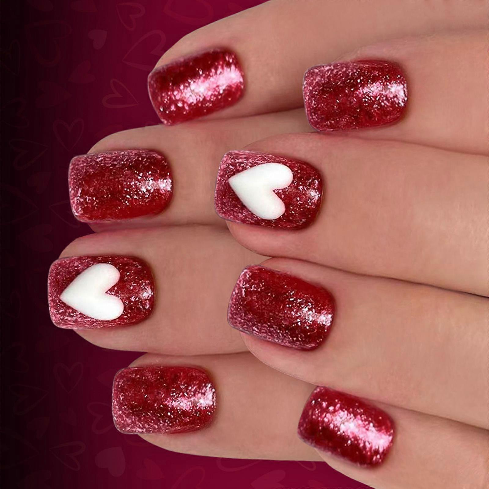 24Pcs Valentine Fake Nail Short Square Glitters Press On Nail Pink Blush Rhinestones Heart Design Non Toxic ABS Matte Party Nail Art Multicolor