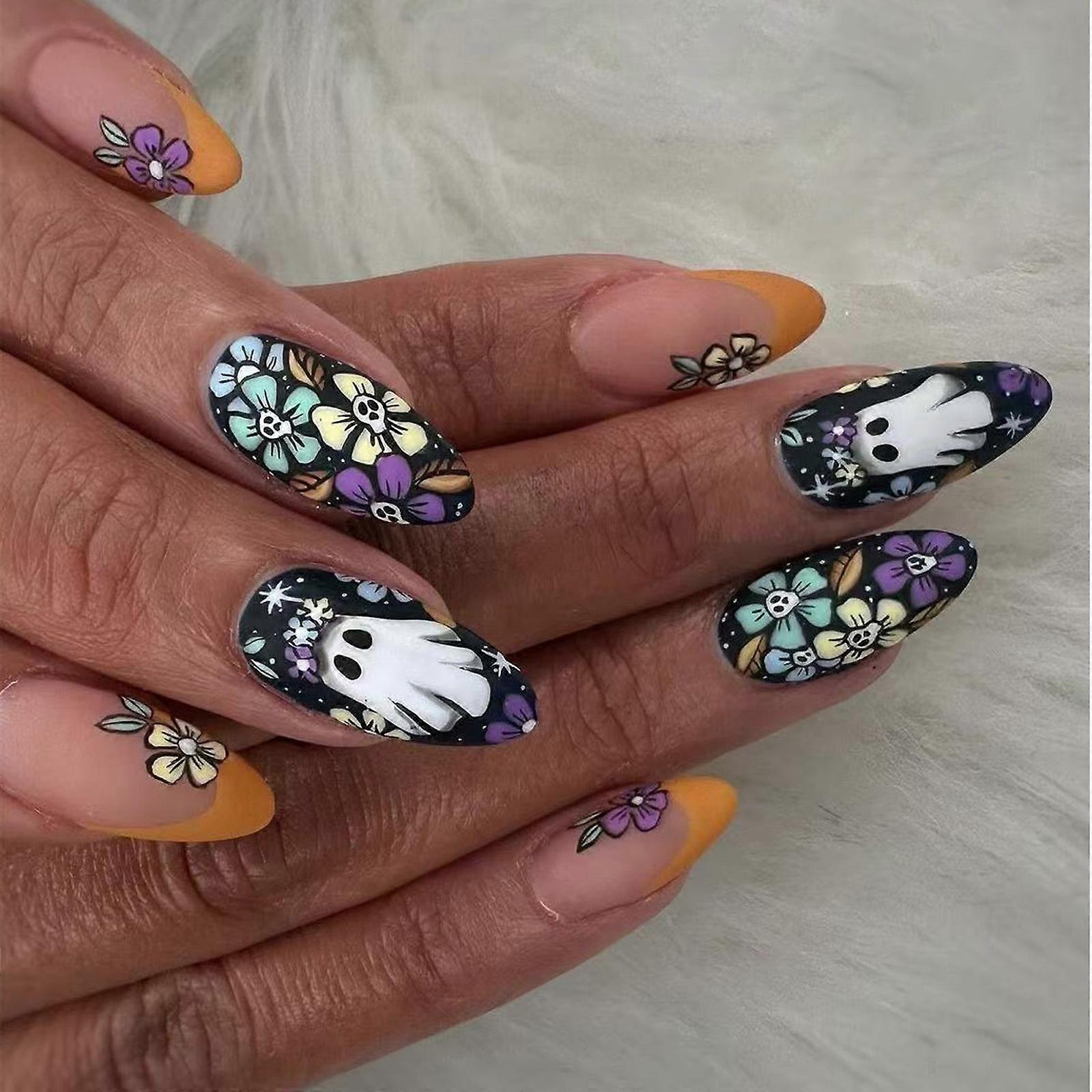 Halloween Themed Press On French Skull Floral Design Lightweight ABS Fake Easy To Wear For Costume Multicolor