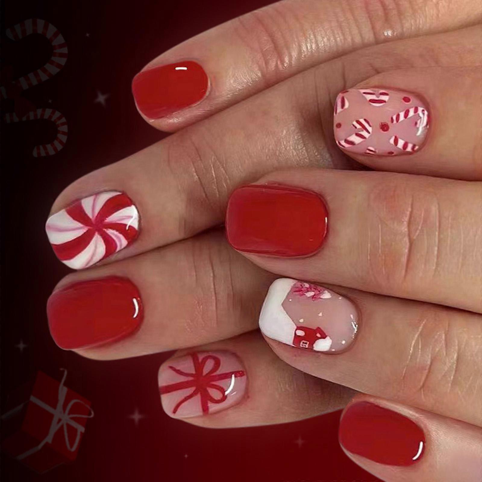 24Pieces Festive False Nail Holiday Candy Cane Glitters Snow Art Easy To Apply Press On Nail ABS Manicure For Women Multicolor