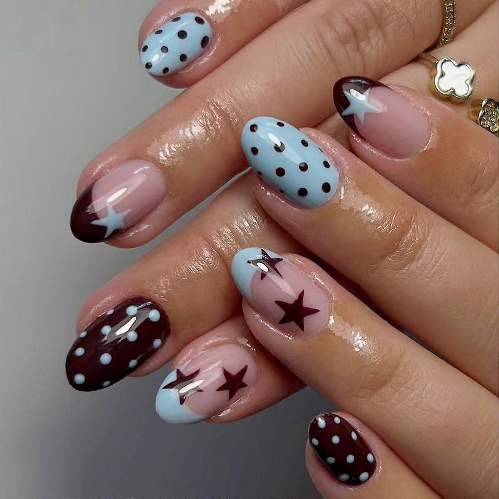 Features: Premium ABS press on nails with French tip design offer durability, lightweighted wear and effortlessly application for salon quality manicures at home. Each 24 piece set features mocha mocha dots and star accents in coordinating blue tones, providing mix and versatility for customized nails art combinations. Ideal for fashion forward women seeking instantly glamouring upgrades particularly busy professional needing quickly beauty solution between work event and social engagements. Seamlessly change from office meetings to weekends brunches with these waterproof, chip resistant nails that maintain elegance through typing, handwashing, and evening celebrations. Safe ABS ensures comfort for 7 to 10 day wear while being cruelty proof and away from harsh chemicals like formaldehyde. Specifications: Component: ABS, good toughness and durability Process: Adopt a fine manufacturing process, with smooth and flawlessly surfaces, sweet and gentle dots pattern desigade. Size: Each box contains 24 false nails, suitable for different hand shapes and nails sizes Featutes: dark brown dots design, unique color jump type Easy to wear and disassemble Package Includes: 24pieces wearable Fingernails note: Please allow 1-2cm errors due to manual measurement. Please allow for slight color differences due to different display resolution.