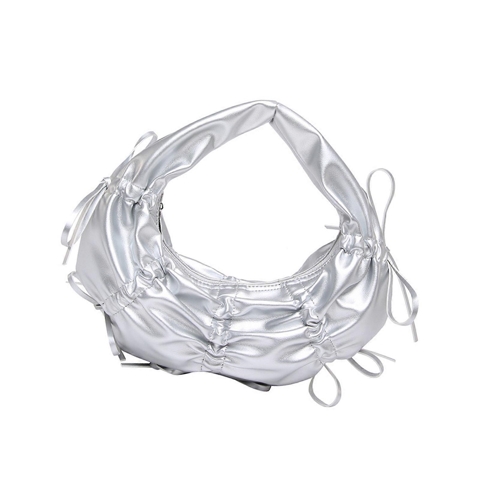 Sophisticated Ruched Evening Clutch with Bows Detail Practical Lightweight Top Handle Bag PU Leather Handbags for Women Silver