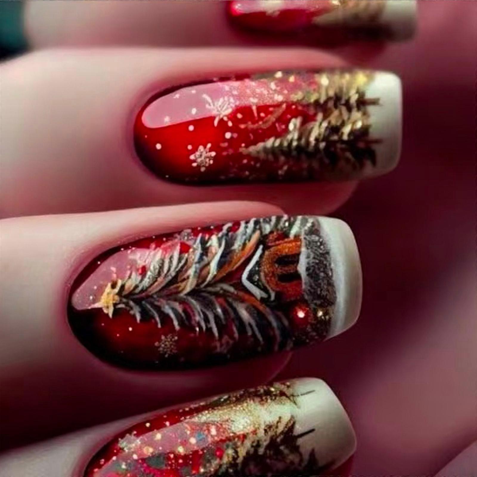24Pieces Rhinestones Press On Nail Red Glitters Snowflake Patterns ABS False Nail For Christmas And Special Occasions Multicolor