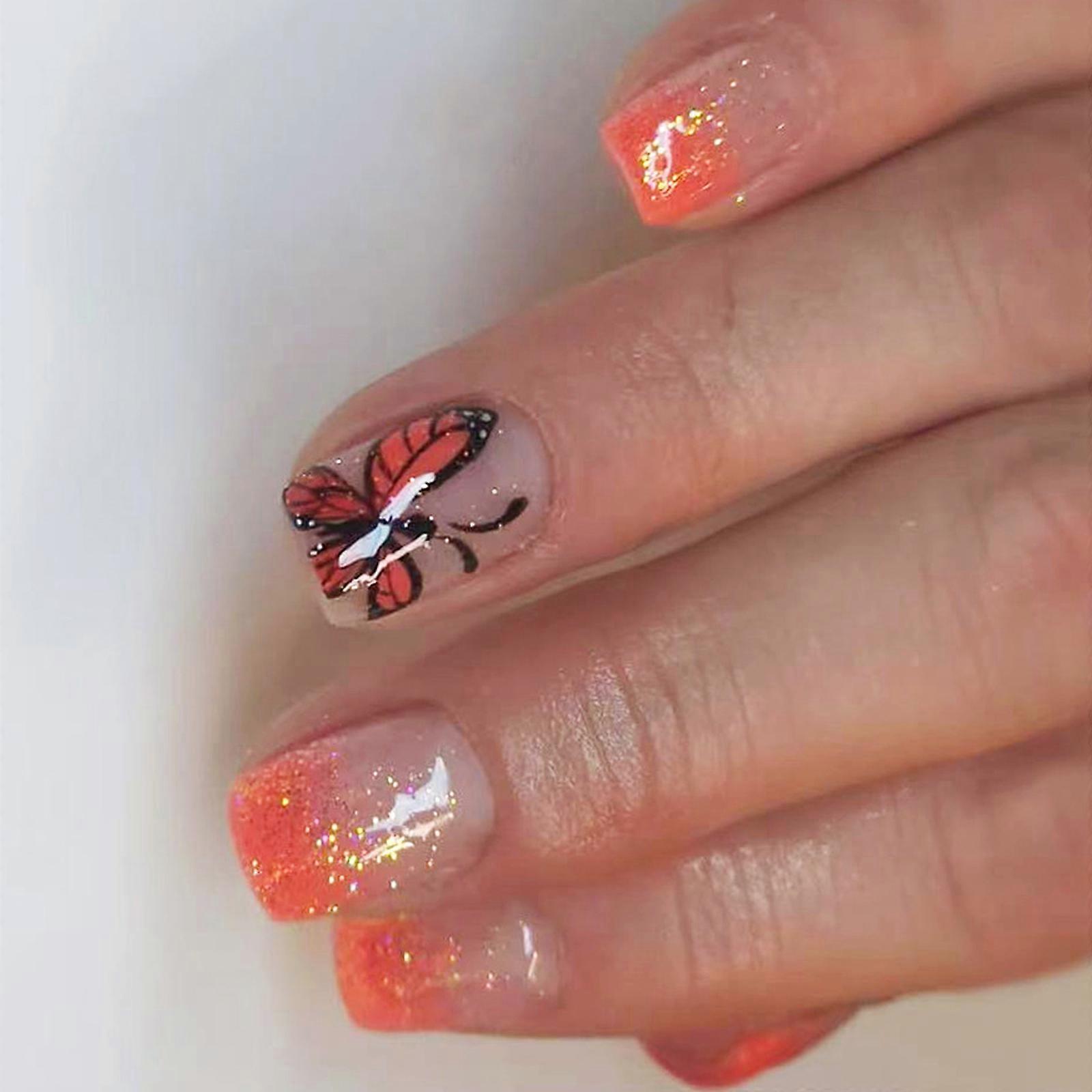 24PCS Orange Glitters Press On Nail Butterfly Embellishments Durability NonToxic False Nail for Girl Party Daily Use Multicolor