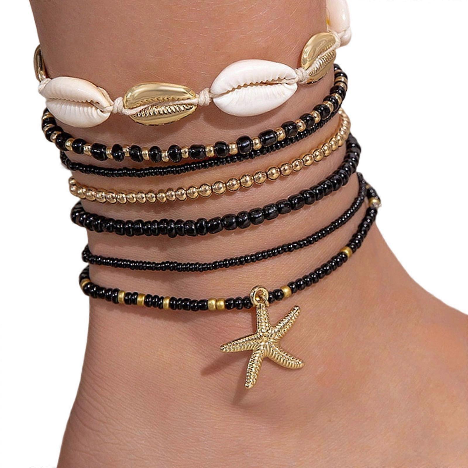 Beach Style Anklet Set 7Pcs Sea Star Shell Design Glass Crystal Foot Chain Summer Party Jewelry Seaside Ankle Chains Multicolor