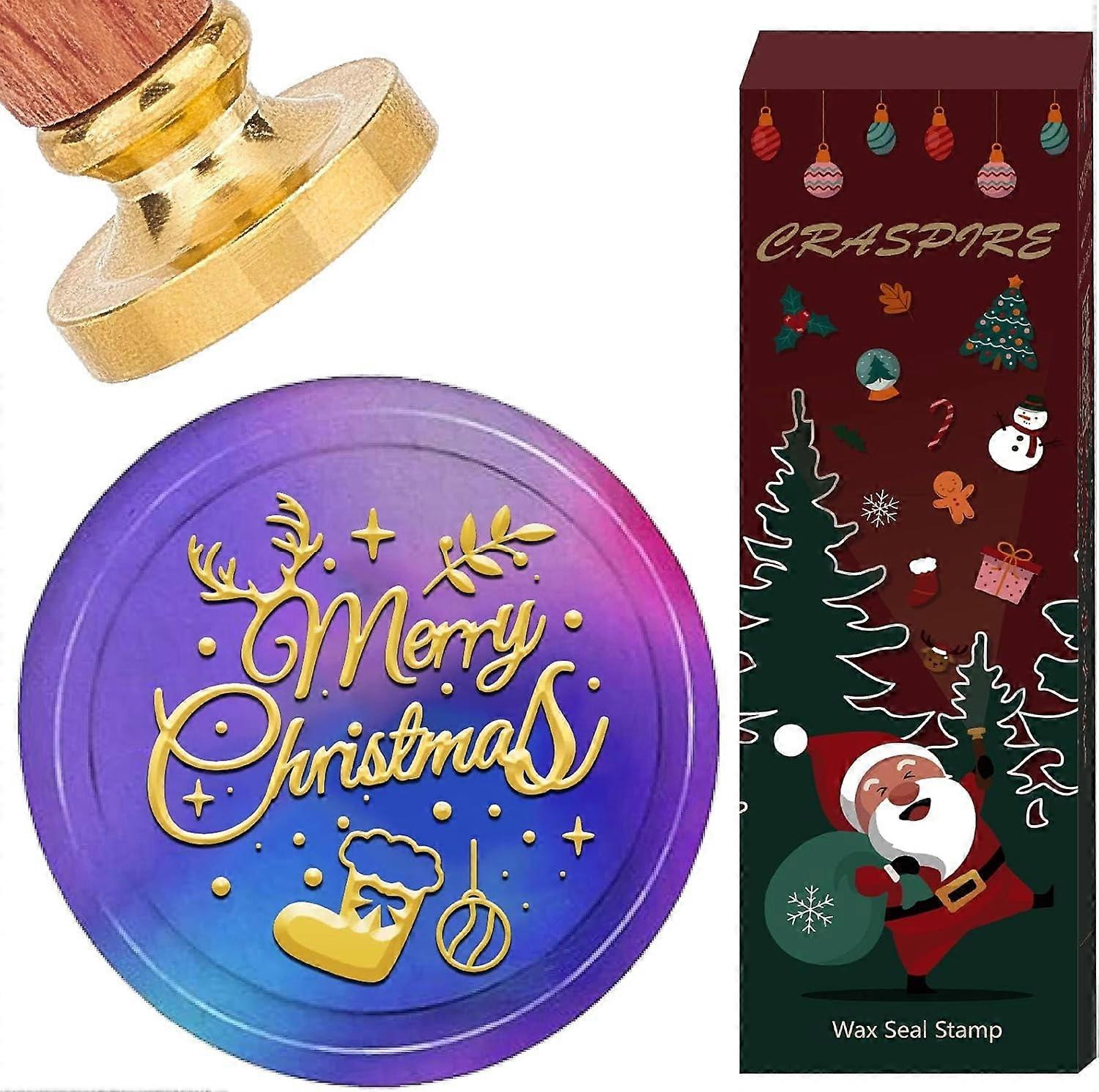 Merry Christmas Wax Seal Stamp 30mm, Removable Brass Head, Compatible with Xmas Stocking Sealing Wax, Wooden Handle, Vintage Elk Antler Design for