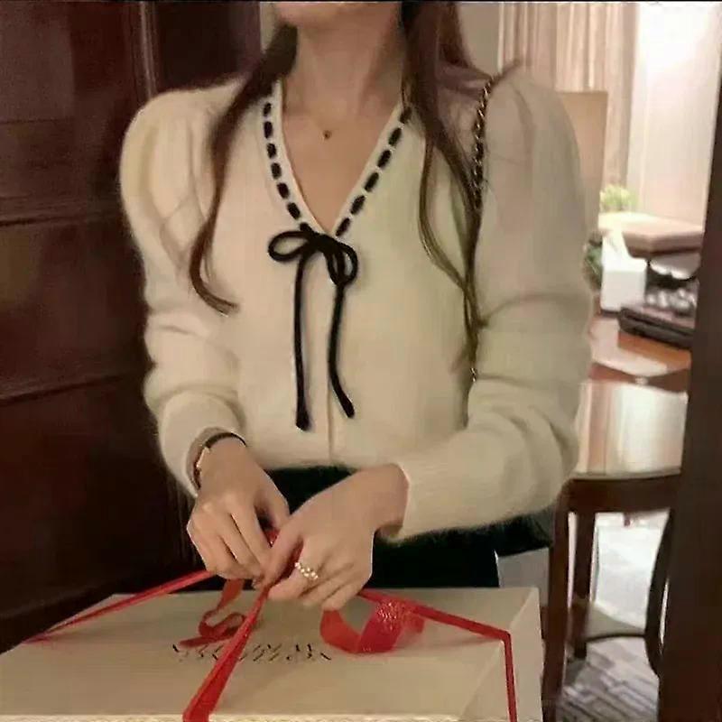 V Neck Knitted Cardigan Bow Lace-up Women Sweater Autumn/Winter Retro Sweet Long Sleeved Casual Coat Fashion Solid Slim Clothing