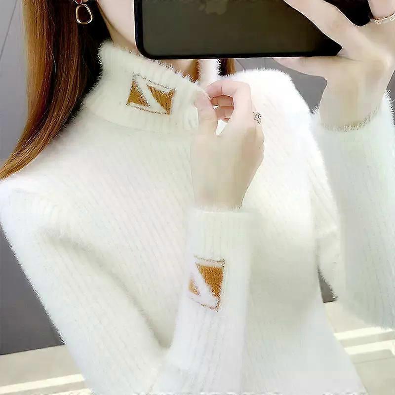 High Collar Pullover Sweater Women Mink Letter Jacquard Underlay Solid Western Knit Undercoat Autumn Winter Pullover Sweater