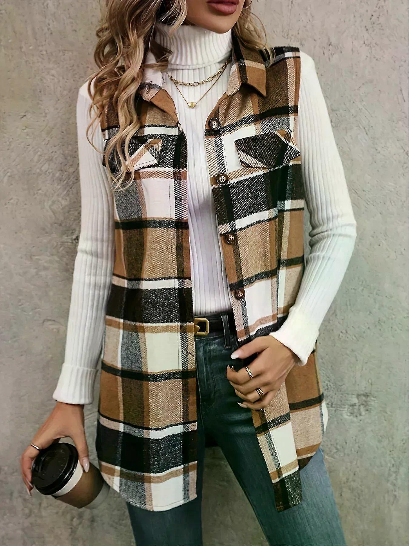 Women Plus Size 1XL-5XL Plaid Print Flap Detail Sleeveless Coat Ladies Fashion Sleeveless Thick Thermal Vest Women Outwear