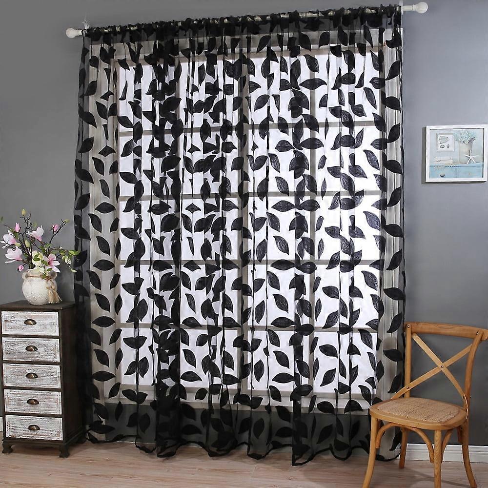 XIUH Home Textile 2pcs Leaf Tulle Door Window Curtain Drape Panel Sheer Scarf Valances (Black)