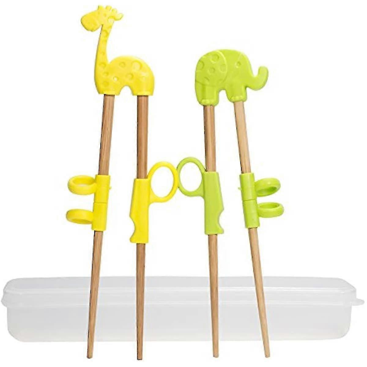 The are made of wood, will not rust, and are strong and durable. 4 different colors, easy to distinguish and use. The ring can be adjusted according to the length of the finger, which is easy to use. Independent transparent storage box, convenient for storage and carrying. Easy to clean and reuse. 1. Training have an easy-to-grip auxiliary ring, which allows children to quickly learn to use . 2. Learn to use , you can move your hands well and promote brain development. 3. Lovely colors and animal patterns make dinner a treat. Product Attributes: Color: Blue, Green, Pink, Yellow Product Weight: 185 g / 6.5 oz Product Size: 18 3 cm / 7.1 1.2 in Package Weight: 205 g / 7.2 oz Packing Size: 16 25 4 cm / 6.3 9.8 1.6 in Package Includes: 1 x Kids Chopsticks - Blue 1 x Kids Chopsticks - Green 1 x Kids Chopsticks - Pink 1 x Kids Chopsticks - Yellow 2 x Storage Box