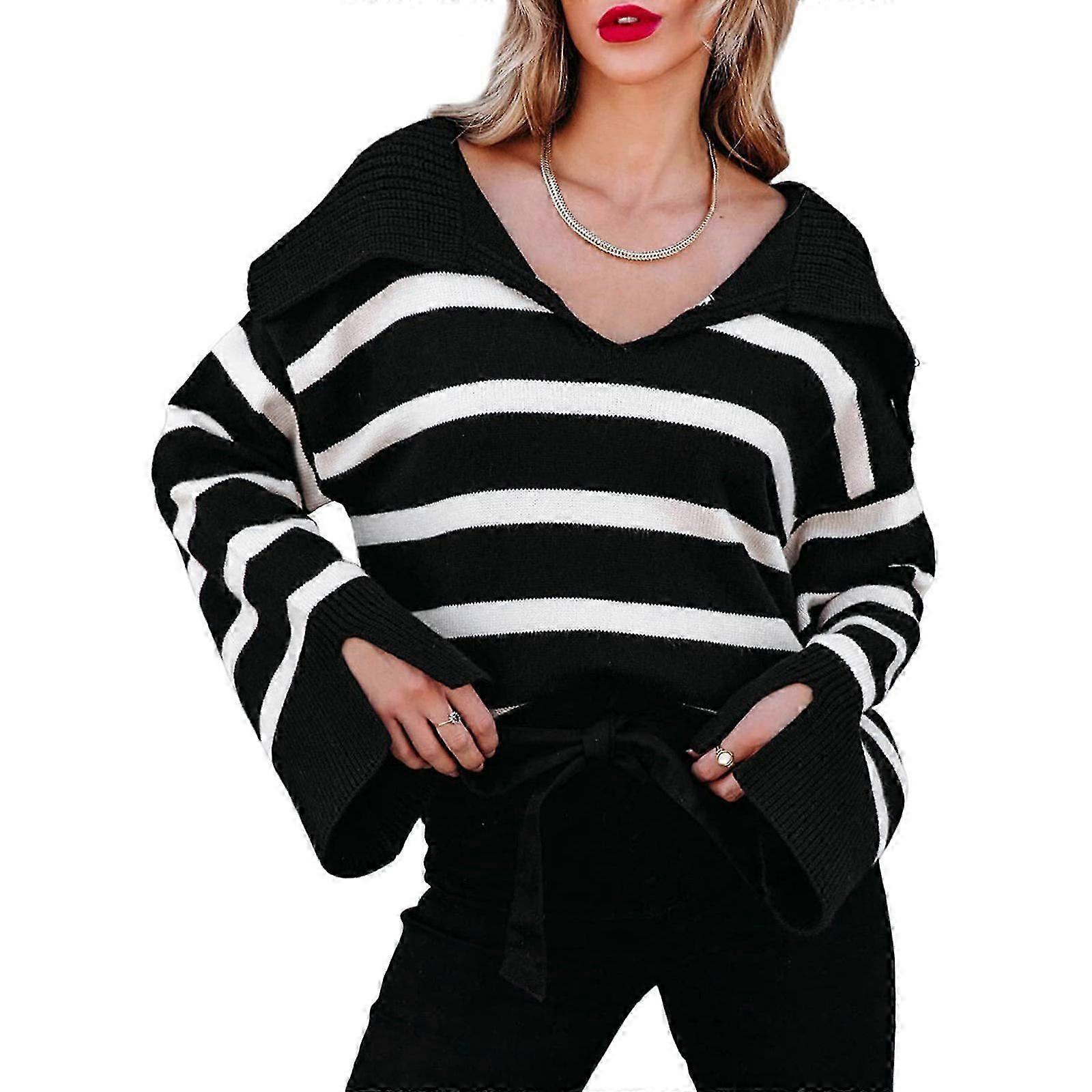 2023 Women Navy Collar Striped Sweater Fashion V-neck Casual Loose Knitted Pullovers Long Sleeved Top Clothes Knitwear rose Red XXL